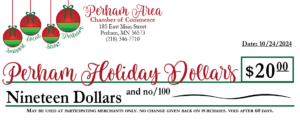 Perham (Chamber) Bucks are available for purchase and spending throughout the year. Perham Bucks are grey in color with orange or blue writing with the chamber logo.